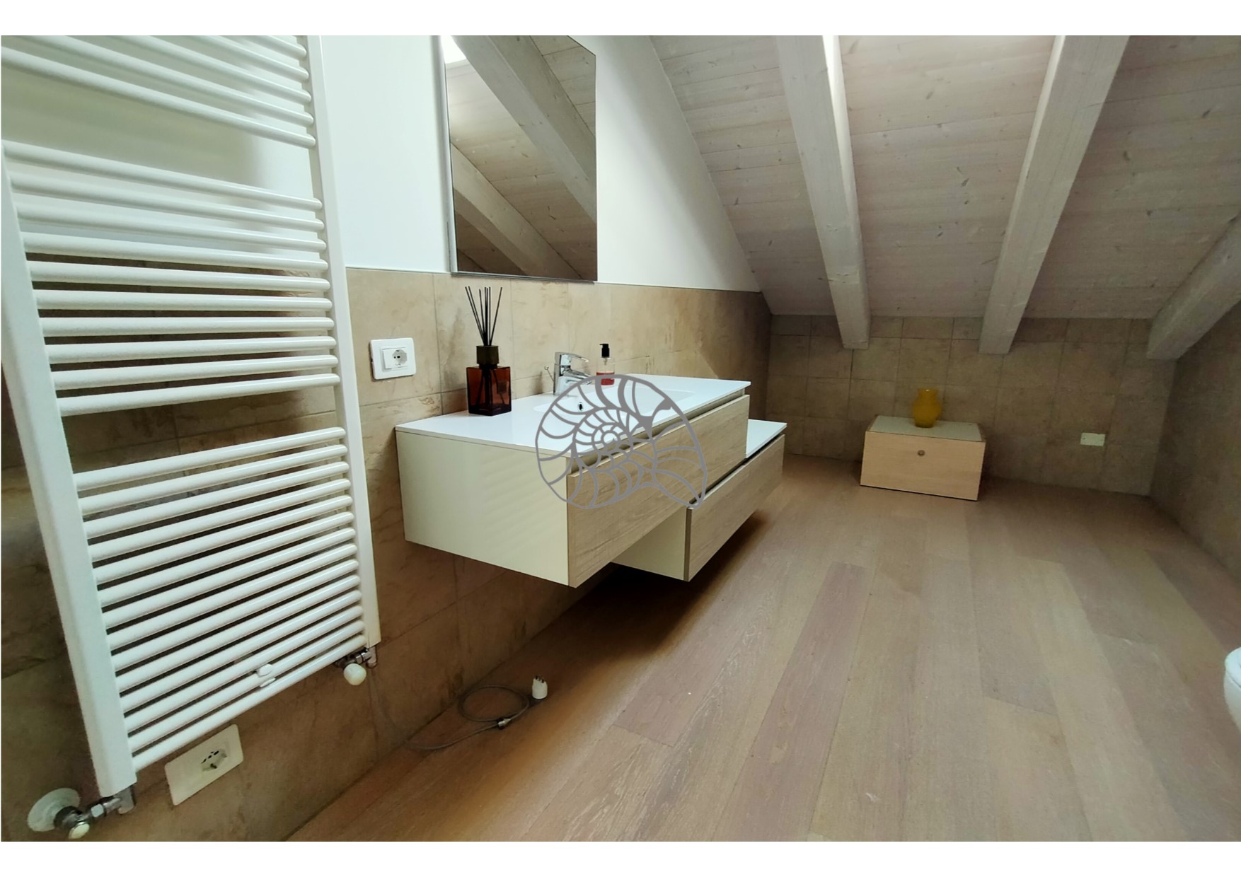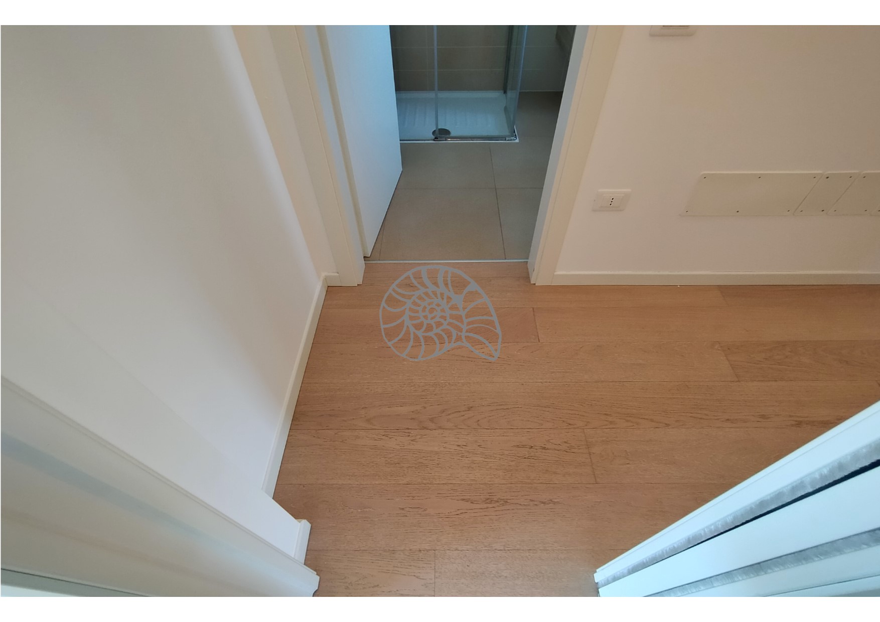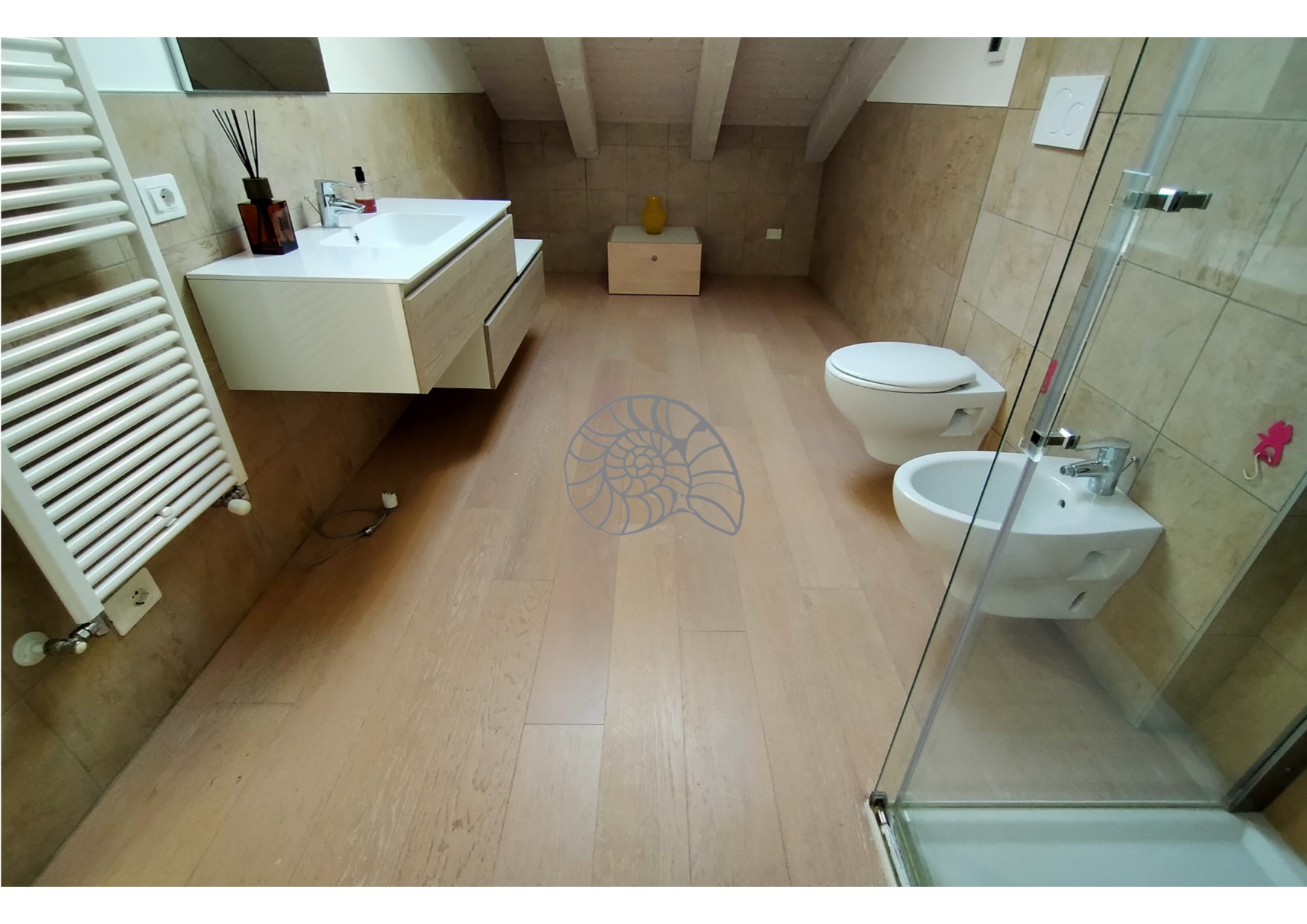 L'appartamento è dotato di riscaldamento a pavimento autonomo a gas con l'integrazione dell'impianto solare termico, impianto d'aria climatizzata con funzione di pompa di calore, serramenti esterni in legno laccato bianco con vetrocamera e scuri laccati, zanzariere, velux motorizzati, porte interne laccate bianche, portoncino d'ingresso blindato, pavimento in legno di Rovere sbiancato in tutta la superficie, sanitari sospesi, videocitofono, luci di emergenza .
