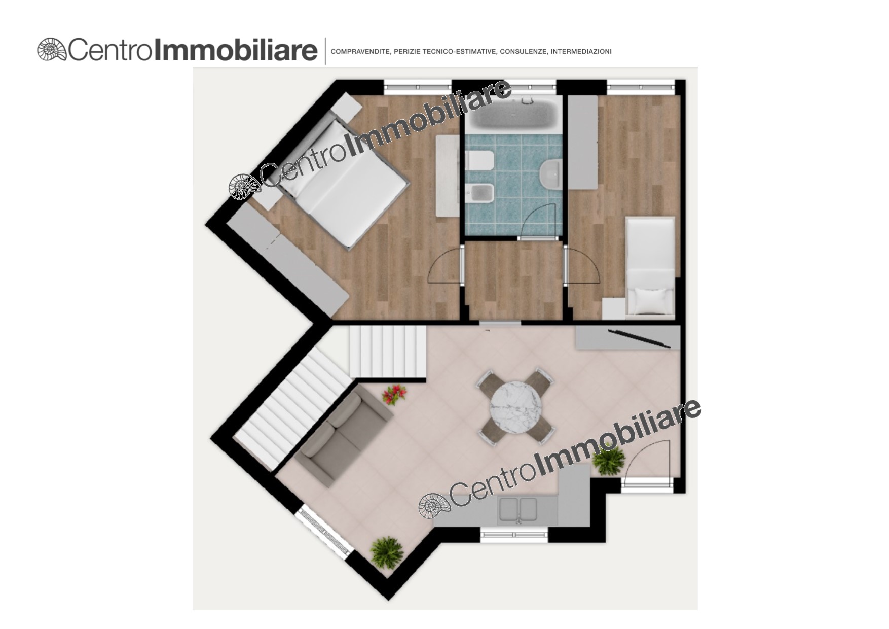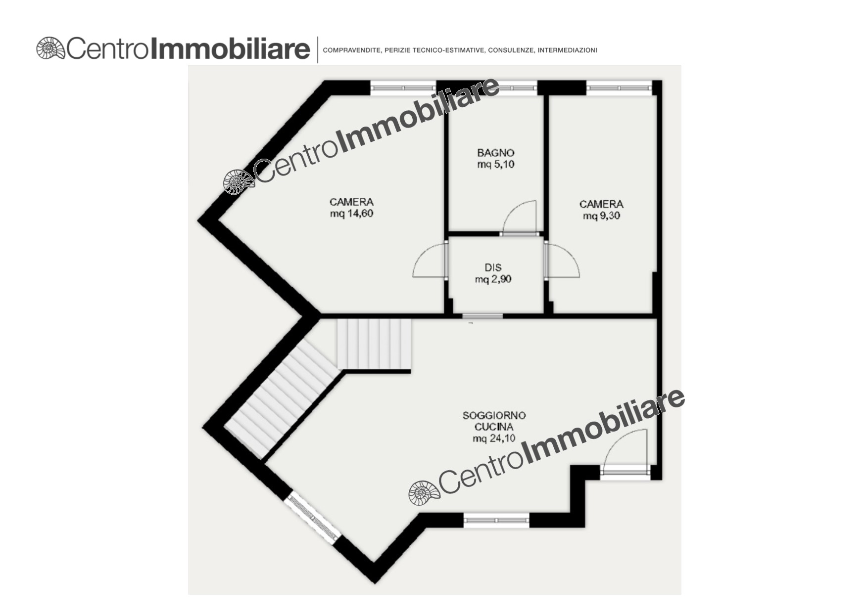 Piano terra: ingresso nel soggiorno-pranzo con zona cucina, disimpegno, bagno, camera matrimoniale, camera singola;