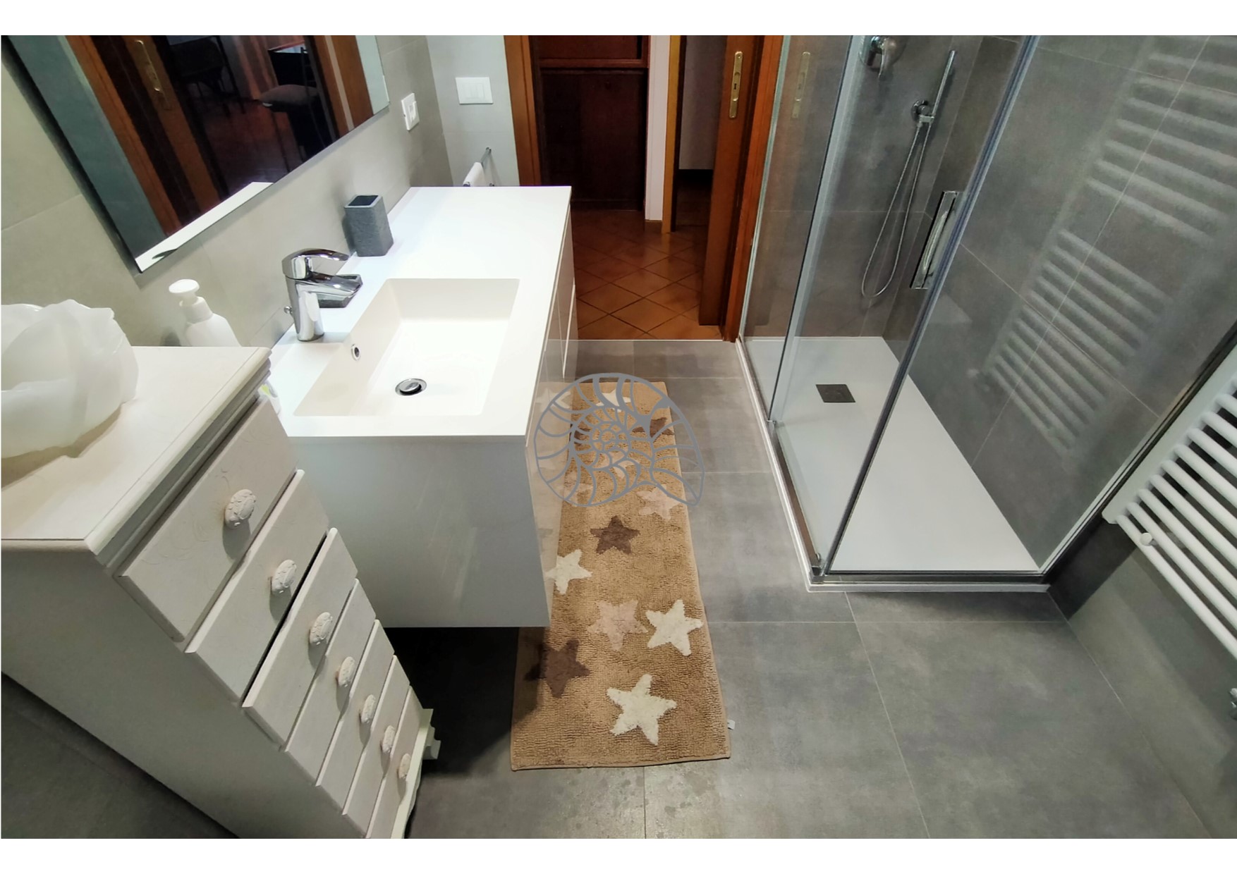 Completano la proprietà un garage di facile accesso fuori terra di mq. 16 e un posto auto riservato nella proprietà condominiale.